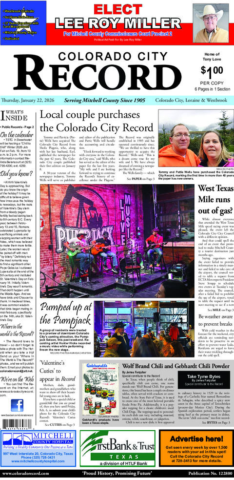 Tommy and Patricia (Pattie) Wells have acquired The Colorado City Record from Sheila Plagens,...
