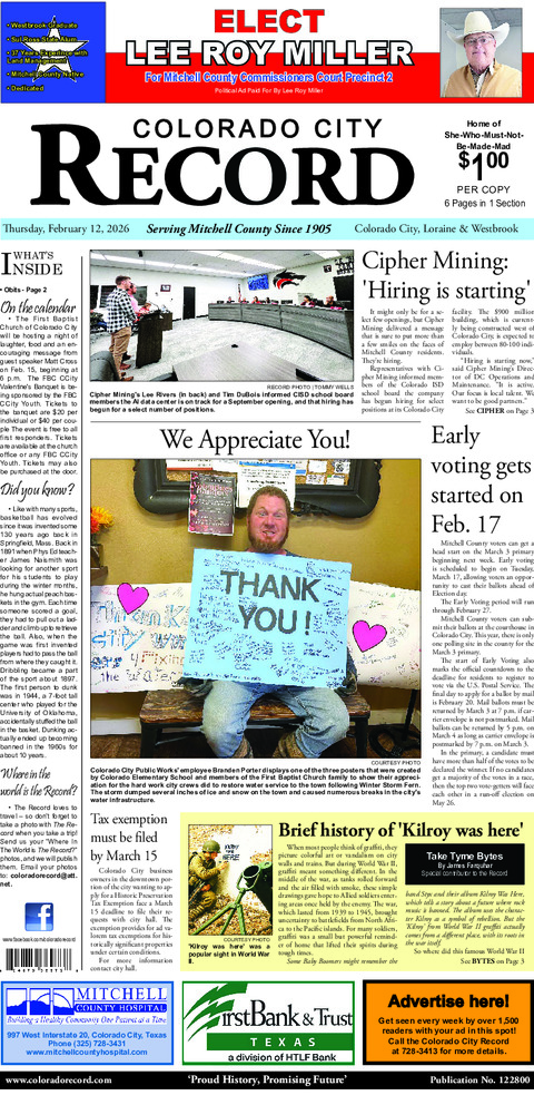 Colorado City Public Works' employee Branden Porter displays one of the three posters that were...